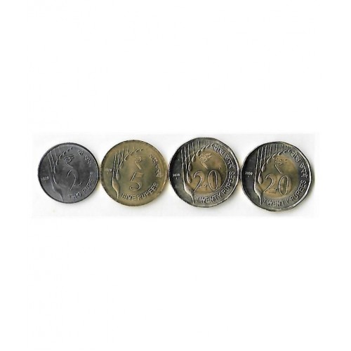 NEW DESIGN FOUR COINN SET ,VERY HARD TO FIND TOO EARLY IN CIRCULATION RUPEES- 2-5-20-20 FOUR COIN SET TWENTY RUPEES ARE BOTH BOMBAY AND NOIDA MINT IN UNC CONDITION COINN ,GEM FOR COLLECTOR ,PLEASE DONT PLACE FAKE ORDER.
