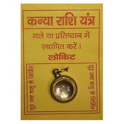 This KANYA RASHI YANTRA is made with brass metal. Keep this KANYA RASHI YANTRA in your home or in cash counter it will give you good luck and wealth.There is one laxmi ganesh,one dhan laxmi locket, gomti chakra, kauri,meru , laxmi charan paduka,kuber yantra