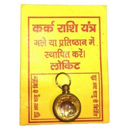 This Kark Rashi Yantra Yantra is made with brass metal. Keep this Kark Rashi Yantra yantra in your home or in cash counter it will give you good luck and wealth.There is one laxmi ganesh,one dhan laxmi locket, gomti chakra, kauri,meru , laxmi charan paduka,kuber yantra.