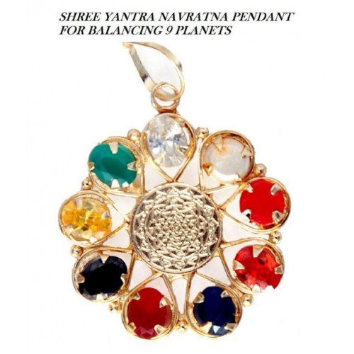 This pendant is a special combination of all nine planetary gemstones known as Navratna Gems. Navaratna is a Sanskrit word which means “nine gems” and is related to the nine planets. The word Nava means ‘nine’ and Ratna means ‘gem’. Each gemstone is related to one Graha among the Navgrahas. he presence of the nine gemstones reduces the negative impact of the nine planets on the lives of the wearer. Regular usage of this pendant promotes positivity.IT IS BELIEVED THAT To attain highest order of wealth and grandeur Shree Yantra is important, So many devotees got wealth after they recite Shreesookta before this Shree Yantra with utmost devotion.Navratna Sri Yantra Pendant is the special pendant with an arrangement of nine important gemstones. Navratna Sri Yantra is found to be a very active remedial solution for those suffering from sinful effects and evil consequences. The good part of the Navratan Sri Yantra Pendant is that it can be easily worn byeverybody.
