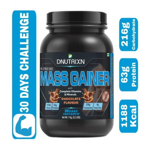 DNUTRIXN SUPREME MASS GAINER- 1KG | 30 Days Challenge with High Protein (63 gm), High Calorie (1188 Kcal) Enriched with Multivitamins and Multiminerals 1 kg Chocolate