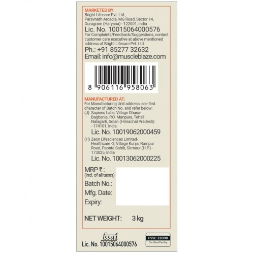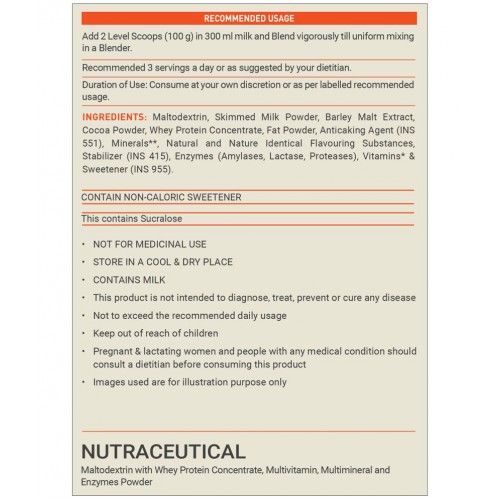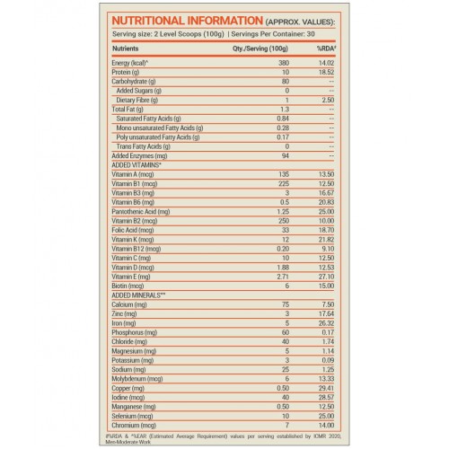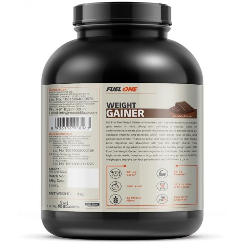 A healthy weight gain depends greatly on a healthy dosage of calories every day. MuscleBlaze Fuel One Weight Gainer provides 1401 kcal per three servings with skimmed milk to fuel your muscles. Enjoy it in delicious chocolate & chocolate bliss flavours. The bulking process is supported by including a much-needed protein in your diet. Thus, this Weight Gainer Protein Powder accomplishes the aim by providing up to 52.5 g of protein from every three servings with skimmed milk to help build lean muscle mass & provide muscle recovery. MB Fuel One Weight Gainer is a carbohydrate powerhouse. Three servings per day provide up to 281.4 g of carbs and keep you energised for long. The calories derived from quality simple and complex carbs work jointly to optimize the glycogen levels and provide energy for your workouts. This weight gainer supplement is a host of a whopping 27 vitamins and minerals to help bridge the nutrient gaps, improve immunity and performance. MB Fuel One Weight Gainer for Men and Women contains essential digestive enzymes such as Amylase, Lactase, and Protease, which help with better nutrient absorption. It also contains dietary fibres to further support easier digestion.