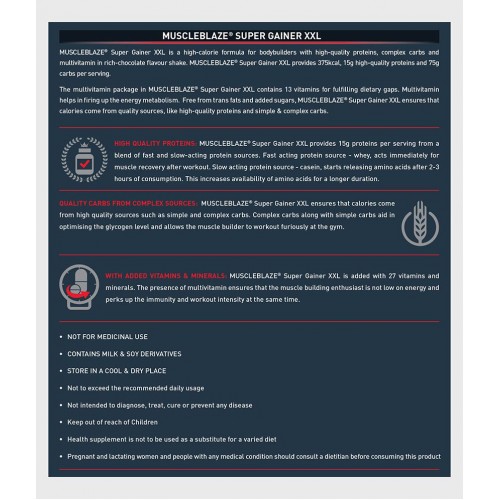 • Muscleblaze super gainer xxl is a high-calorie formula for bodybuilders in rich chocolate flavour