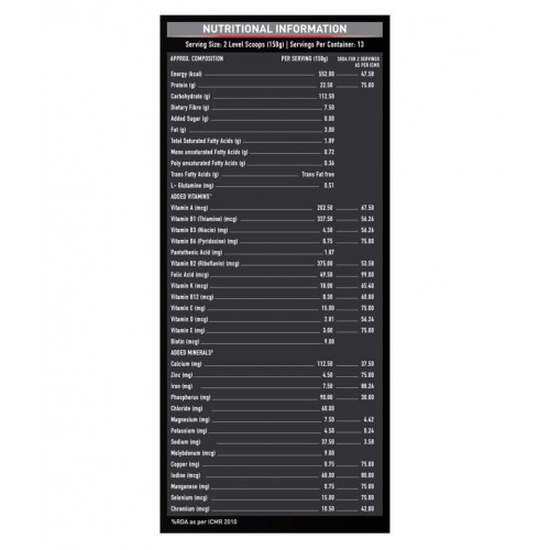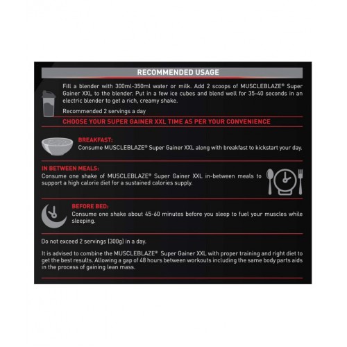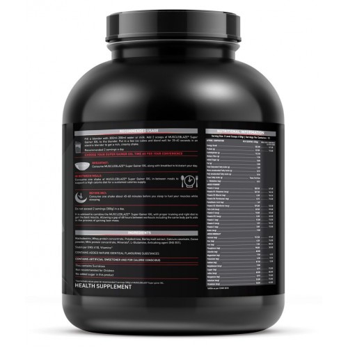MuscleBlaze super gainer XXL is a high-calorie formula for bodybuilders in rich creamy cookies & Cream flavor. Proteins and carbs in the ratio of 1:5 in MuscleBlaze super gainer XXL build energy and strength for the brute training sessions. Transforming the body from thin to muscular requires you to eat calorie-rich healthy foods and workout intensely. However, eating lots of foods is not that easy in real life, more so, if you travel. Benefits no-added sugar and zero trans fats in MuscleBlaze super gainer xxl ensure that calories come from quality nutrients. MuscleBlaze super gainer xxl provides 1121 calories, 45g proteins and 224g carbs every day in an easy-to-mix chocolate flavour shake. The multivitamin package in MuscleBlaze super gainer contains 13 vitamins and 14 minerals for fulfilling dietary gaps and firing up the energy metabolism. Serving suggestion mix two level scoops (150g) of MuscleBlaze super gainer in 200ml water/milk. Blend for 45-60 seconds to get a thick and creamy shake. Do no exceed 2 servings (300g) in a day.