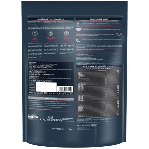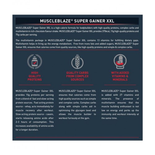 MuscleBlaze Super Gainer XXL is a sports nutrition supplement dense in calories and crafted for elite fitness freaks who strive to gain huge muscles & a sturdy physique. It presents a unique blend of protein and simple & complex carbs that fuel your muscles to get the faster recovery and enhanced protein synthesis. You get 22.5 grams of protein derived from quality sources per 100 grams of serving with milk. Consume super gainer protein powder anytime and get 462 kcal per serving for premium clean quality carbs that can fuel you for longer.Nutrition is just as important as workout routines; therefore this super gainer fuel contains no added sugar and is trans-fat-free. It is loaded with 27 vital vitamins and minerals to support workout performance and improve immunity. Added digestive enzymes and dietary fibre enhance your overall experience. Available in a wide range of flavours like chocolate, cookies & cream, chocolate mint, chocolate cinnamon, choco coconut, mango burst, kulfi, and banana to satisfy the taste along with nutrition needs