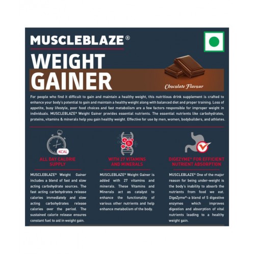 MuscleBlaze Weight Gainer is formulated with a balanced blend of protein, carbohydrates, fats, vitamins and minerals to ensure healthy weight. With the amount of calories it delivers per day when consumed thrice, your body gets an magnified pump with a constant supply of energy that helps you gain strength and endurance for your rigorous workout. 2g of fiber in every 100g makes sure that this mass gainer isn’t heavy on your stomach and gets quickly digested for faster results. 1) Provides energy to the body 2)Increases lean muscle mass 3) Contains fibre for better digestion 4)