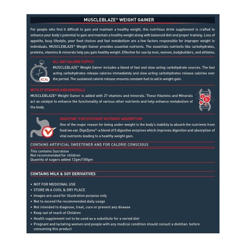 MuscleBlaze Weight Gainer is formulated with a balanced blend of protein, carbohydrates, fats, vitamins and minerals to ensure healthy weight. With the amount of calories it delivers per day when consumed thrice, your body gets an magnified pump with a constant supply of energy that helps you gain strength for your rigorous workout. 2g of fiber in every 100g makes sure that this mass gainer isn’t heavy on your stomach and gets quickly digested for faster results.