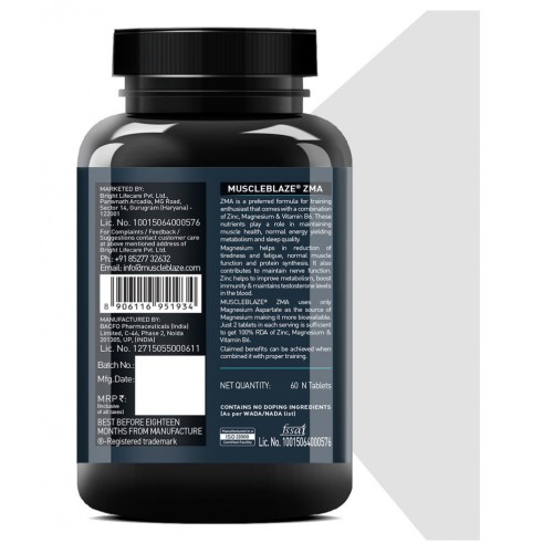 Athletes and bodybuilders may have lower zinc and magnesium levels in their bodies because of restrictive diets or lose these minerals through excessive sweat and urination. Thus, fulfilling the micronutrient gap is crucial for better performance and overall health. MuscleBlaze ZMC supplement is packed with zinc, magnesium, and vitamin B6. Magnesium aspartate is the only magnesium source in MB ZMC, therefore, it provides better bioavailability for improved muscle strength, better muscle recovery, supports nerve function, promotes better sleep, and reduces fatigue. The benefits of zinc are well-known but when it is combined with magnesium it is more effective. Zinc helps improve protein synthesis, boosts muscle strength and size, increases the production of testosterone in the body, and enhances immunity. Vitamin B6 is a water-soluble vitamin that can’t be produced by the body so it must be consumed through food or supplements. It has a significant role in improving mood and creating neurotransmitters.\nThese ZMC tablets are safe for use and easy to consume and can be checked for authenticity via SMS or MuscleBlaze website.