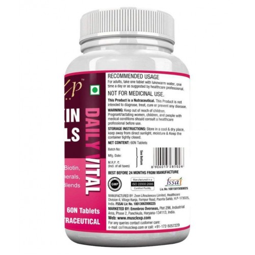 MuscleXP Hair Skin and Nails MultiVitamin with Biotin helps Promote Hair Growth, Glowing Skin and Strong Nails. It contains powerful grape seed extract specially combined with vitamins, minerals, amino acids, and nutrients important for helping to maintain or obtain healthy hair, skin and nails. Each tablet offers vitamins, biotin, antioxidant vitamins C & E, and other essential nutrients to support luxurious hair, gorgeous skin and healthy nails.THE HAIR, SKIN, NAILS DAILY VITAL + Biotin ADVANTAGE. It contains just the right balance of nutrients to help support lustrous hair, strong nails and vibrant skin. This innovative formula provides you with the vital nutrients your body needs to support your natural beauty from within. B Vitamins help with energy and Biotin helps to maintain healthy hair. Vitamin E and Vitamin C are antioxidants. Vitamin E contributes to skin health, and Vitamin C is involved in collagen production and formation, which forms the basis for vibrant skin. Vitamin A assists with skin maintenance, and overall health. Advanced MultiVitamin Formulation contains 19 Vitamins in almost 100% RDA limits and Minerals, brain health Blend, Grape Seed Extract, 13 Amino Acids. It also contains 100% RDA of Vitamin A β-Carotene.RECOMMENDED USE For adults, take one tablet with lukewarm water, one time a day or as suggested by healthcare professional. Made in India as per International Manufacturing Standards NSF-GMP, ISO 22000, OHSAS 18001 & ISO 14001 certified.