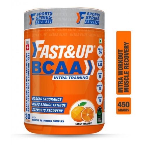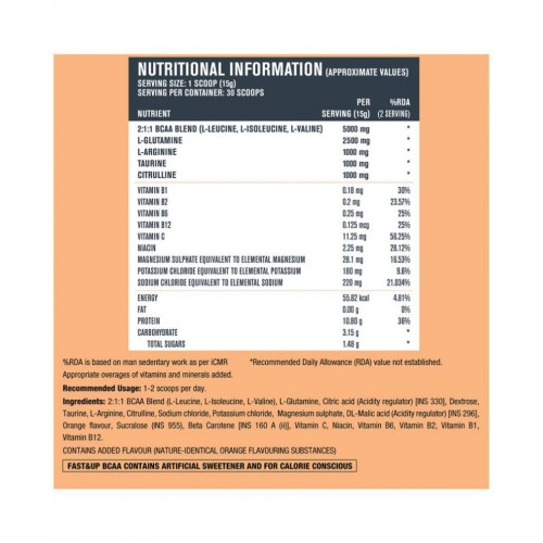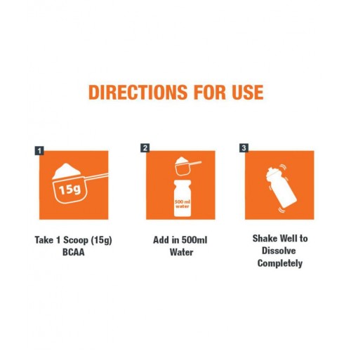 Fast&Up BCAA with its advanced formulation containing 5g of three essential amino acids namely, L- Leucine, L-Isoleucine, and L-Valine in an ideal 2:1:1 ratio serves as an ideal intra-workout nutrition. 10.5g of pure amino acids helps in improving muscle strength and recovery. With added muscle activators such as L-Glutamine, L-Arginine, Taurine, Citrulline as well Electrolytes and Vitamins, Fast&Up BCAA helps in reducing muscle fatigue, boosts energy and tackle fluid loss during workout.