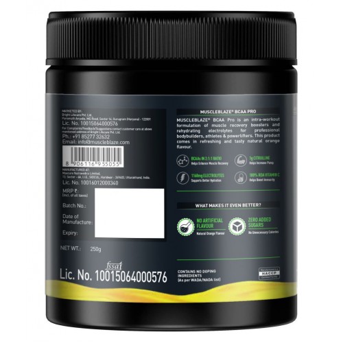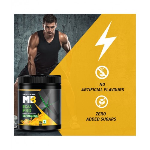 MuscleBlaze BCAA Pro is formulated keeping the constitution of your muscles in mind to enhance endurance and support faster muscle recovery. With this BCAA powder, you get 7 g BCAA and 100% RDA of Vitamin C in each 15 g serving to fuel your muscles, accelerate muscle recovery for longer workout sessions and enhance immunity. To stay hydrated during your workouts, you also get 1168 mg of electrolytes. Zero added sugar reduce unwanted calories in this intra-workout supplement. This robust BCAA supplement for men and women is available in delicious flavours - Fruit Splash, Green Apple, Watermelon, Mango Explosion, Pineapple, Blueberry Lemonade, Icy Blue Razz, Natural Grape, and Natural Orange. Natural Grape and Natural Orange flavours contain no artificial flavours.