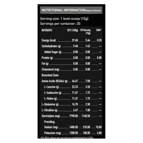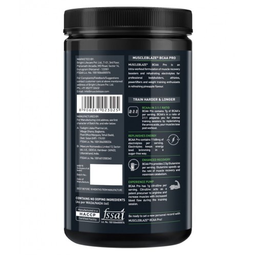 MuscleBlaze BCAA Pro is an intra-workout formulation of muscle recovery boosters and rehydrating electrolytes for professional bodybuilders, athletes, powerlifters and weight training freaks. The unique mix of Branched Chain Aminos, Glutamine and Citrulline Malate in refreshing watermelon flavour lets you train harder and longer, without getting tired.