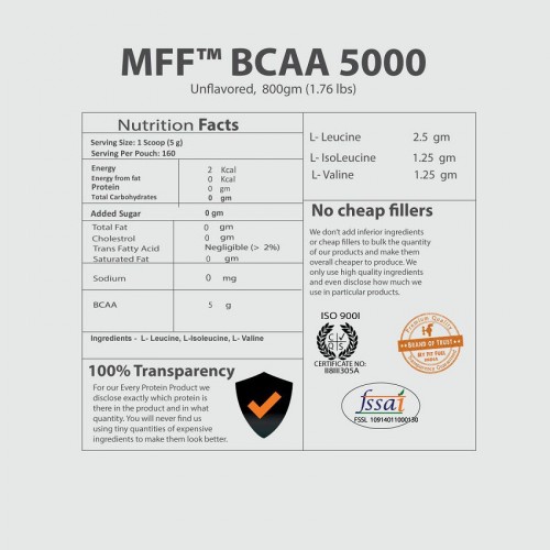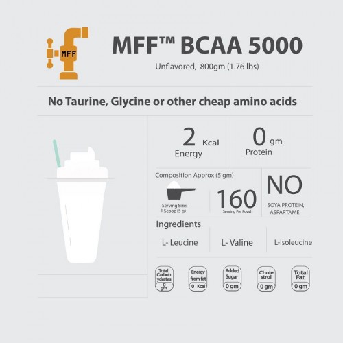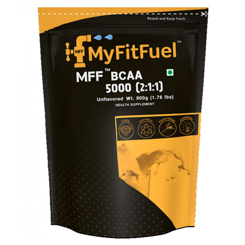 MyFitFuel is now trusted by 100,000+ Happy Customers. MFF™ BCAA 5000 is very pure form of Branched chain amino acid found in the market today. Keeping the quality standards high, every 5gm serving of MFF™ BCAA 5000 provides 3 essential amino acids Leucine (2500 mg), Iso-Leucine (1250 mg) and Valine (1250 mg). These amino acids are not synthesised by our body making them essential to be consumed additionally to achieve better muscle building goals. What is BCAA? Branched chain amino acids also commonly known as BCAA are made up there amino acids Leucine, Iso-Leucine and Valine. BCAA is very commonly used to bring better potential effects during anti-catabolic (preventing muscle breakdown) and muscle building stages. The proven 2:1:1 ration contains higher percentage of Leucine which helps in better protein synthesis of muscles helping you achieve better quality muscle building. Muscle Mass Growth = Rate of Protein Synthesis – Rate of Protein Breakdown. What are the Benefits of taking BCAA? • Increases protein synthesis helping to trigger muscle growth. • Helps in maintenance of Lean Muscle Mass during rest period. • Enhances fat burning process as leucine increases fat oxidization and energy expenditure process where as isoleucine improves tolerance of glucose in body. • Helps in improving neuromuscular adaptations which enhances strength development from training. • Decreases body fatigue and enhances endurance performance. • Prevents muscle loss during intense or long duration workouts.