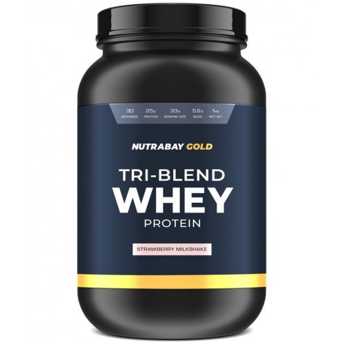 NUTRABAY Gold Tri Blend Whey Protein Powder (Hydrolyzed, Isolate & Concentrate) - 25g Protein, 5.6g BCAA, 4.2g Glutamic Acid- 1Kg, Strawberry Milkshake (30 Servings)