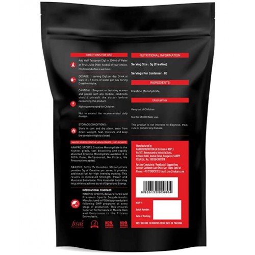 Nakpro Sports Advance Micronised Creatine Monohydrate is the most potent, unadulterated and finest creatine powder helps in improving strength, power and allows to gain lean muscle mass.One serving of Creatine Monohydrate delivers 3 grams of creatine and helps to replenish its store in the body.Micronized creatine monohydrate is essential in the process of sending energy directly to muscles and has been shown to help increase overall muscle mass and strength Creatine Monohydrate powder is free of yeast, sugar, soy, dairy, and is naturally gluten-free to support your muscle growth Creatine Monohydrate Is Every Bodybuilder's Secret Behind Muscle Building, Gaining Strength And Improving Performance Nakpro Sports Advance Creatine is micronized, so it easily mixes into your pre-workout or post-workout shake or drink.