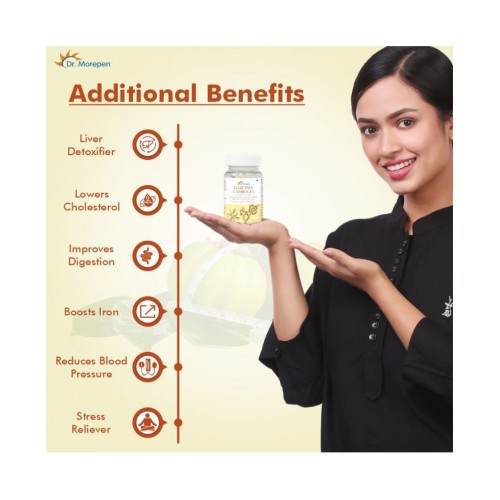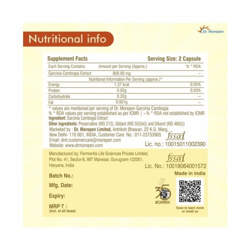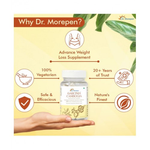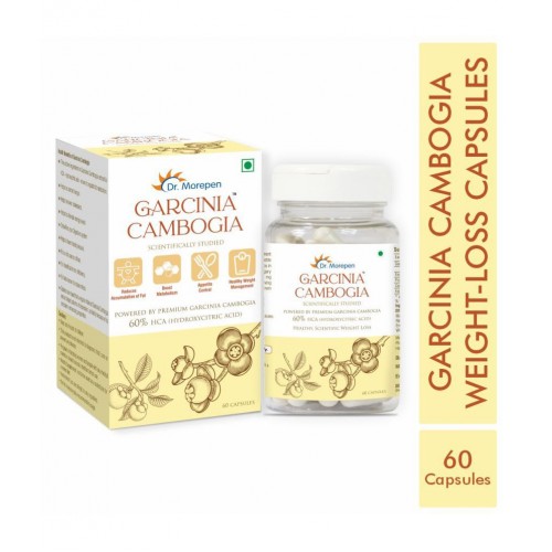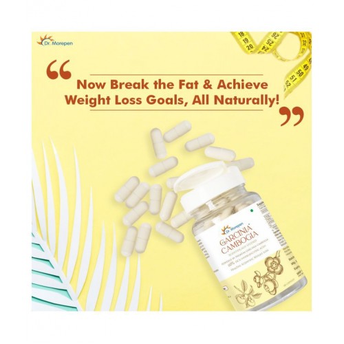 FAT STORAGE REDUCTION: Garcinia Cambogia extract helps reduce or slow fat production and accumulation in the body. It increases the fat-burning potential of the body, thus helping to remove stored body fat which leads to belly fat and obesity. BOOSTS METABOLISM: The active ingredient in Garcinia Cambogia extract is HCA – Hydroxycitric acid which is known to regulate fat metabolism. It keeps your digestion sound and healthy by processing fats and balancing the stomach’s acidic level for smooth bowel movement. CONTROLS APPETITE: The capsule will give you a sense of feeling full throughout the day to help you in controlling unnecessary hunger. It ensures that you eat just the right amount of food required by the body by overcoming emotional eating habits and junk food cravings. MANAGES CHOLESTEROL & DIABETES: Loss of extra weight helps keep blood sugar and cholesterol levels in check. Dr. Morepen Garcinia Cambogia Capsules is the best pick for diabetic patients as it improves cholesterol level by lowering triglycerides & bad cholesterol (LDL) while raising the good one (HDL) in the body. LIVER PROTECTIVE: It is a liver protective solution for weight management as it detoxifies the liver from various toxicity through its anti-oxidant properties. It helps draw out & cleanses the toxins from the liver naturally. And not to forget a better Liver helps in better nutrient absorption too. TRUST & QUALITY: Dr. Morepen ensures the highest quality formulation with rigorous checks & testing. We bring the Trust and Credibility of more than 20 Years to give you the best of Nature backed by Science.