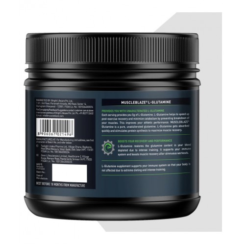 MuscleBlaze L Glutamine is a health supplement enriched with rich ingredients required for the development and strengthening of your muscle mass. It restores the glutamine level in your muscles, which gets depleted due to intense workouts. It supplies proteins to your muscles and thereby helps in enhancing your performance during workout. It also aids in the synthesis of proteins. Intake of this supplement can help you exercise for long without breakdown of your muscle tissues. Its rich ingredients help in the maintenance of your body’s metabolic processes and improve your workout performance. This supplement can help in speedy recovery of your muscle tissues from fatigue and soreness caused due to tough workouts. Further, it is enriched with digestive enzymes that ensure healthy digestion and keep your digestive tract healthy. This supplement also enhances our immune system, and protects you against various harmful infections. 5g of micronized glutamine in each serving speeds up recovery after workout Improves your body's metabolism Enhances your immune system
