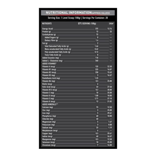 The all-new MuscleBlaze Super Gainer XXL is an advanced formula dense in carbs crafted exclusively for hardcore bodybuilders. This unique formula helps them in reaching their goal of mass gains. With 1 level scoop (100g) of MuscleBlaze Super Gainer XXL Chocolate, you get 15g protein and 75g carbs that fuel your muscles with a sustained calorie supply.