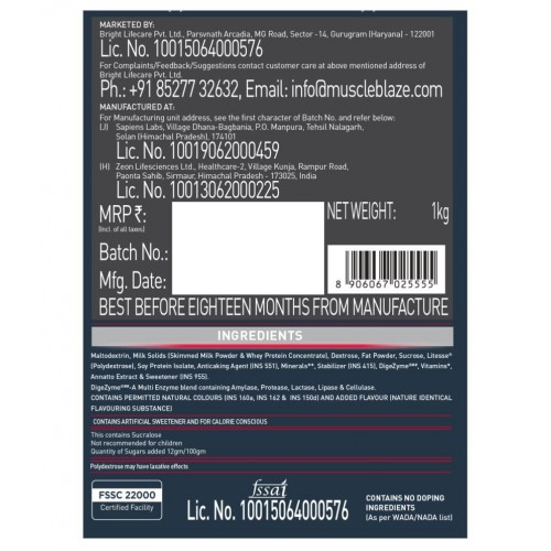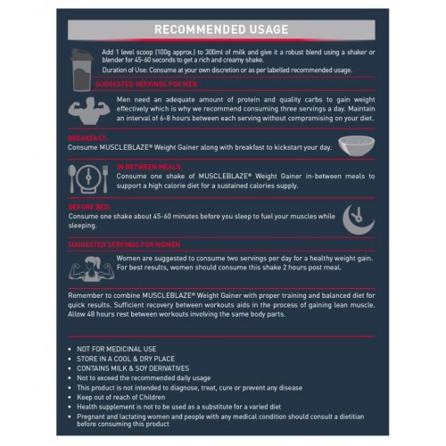 MuscleBlaze weight gainer with added digezyme encourages healthy weight gain in individuals who have tough time gaining and maintaining weight. Serious weight gain requires serious calories. In real life, consuming large quantity of food is difficult. Factors like poor appetite and hectic lifestyle act as common challenges for weight gain. MuscleBlaze weight gainer in addition to a balanced diet fulfills high calorie needs with premium nutrition. Each serving provides high quality proteins, complex carbs, and digestive enzymes in a ready-to-drink chocolate flavored shake. Anyone who wants to gain weight in simple and effective way, be it men, women, bodybuilders or athletes would see immediate results when taken in recommended dosage.