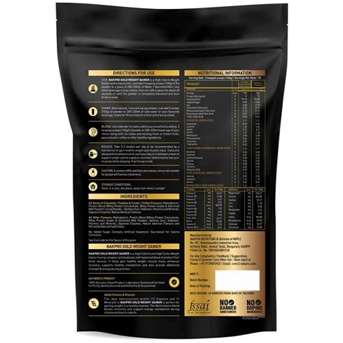 NAKPRO GOLD WEIGHT GAINER is a high calorie and high carbs weight gainer having complex carbohydrates with balanced blend from protein for three source it helps gain healthy weight, muscle mass, enhances recovery, supports healthy metabolism and also provide additional strength & energy during activities. Direction For Use. STIR: NAKPRO GOLD WEIGHT GAINER is a high calorie weight gainer and is easy to mix. Just add 3 heaping scoops (100g) of the powder to a glass of 200-220ml of water/skimmed milk/any other beverage of your choice, then stir with a spoon for about 30 seconds or until the powder is completely dissolved and your drink is ready. SHAKE: Alternatively, if you are using a shaker, just add Just add 3 heaping scoops (100g) of the powder to a glass of 200-220ml of cold water or your favourite beverage, shake for 30 seconds for a thick and creamy shake. BLEND: Use a blender to make a delicious smoothie by adding 3 heaping scoops (100g) of the powder to 200-220ml beverage of your choice along with ice cubes and exciting fresh or frozen fruit, peanut butter, coffee or other healthy ingredients. DOSAGE: Take 2-3 shakes per day or as recommended by a nutritionist to gain healthy weight and muscle mass. CAUTION: It contains milk and dairy derivatives, hence not suitable for people with lactose intolerance. STORAGE CONDITIONS: Store in a cool, dry place, away from direct sunlight.
