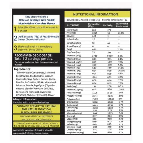 Directions for Mixing: Take 250-300 ml chilled water or milk in a shaker and add 2 scoops of Pro360 Muscle Gainer protein powder. Shake well before drinking. Pro360 Muscle Gainer Protein Powder provides 280 kcal energy, 38 grams of protein (per serving 75g or 2 scoops), when mixed with 250-300ml of water Contains high quality muscle building protein for gaining weight fast, in tasty chocolate flavor Contains no Dextrose, Sucrose, or banned substances Can be used as a post-workout drink formulated with multi protein, BCAA, creatine and digestive enzymes. Directions to Use: Take 250-300 ml chilled water or milk in a shaker and add 2 scoops of Pro360 Muscle Gainer protein powder. Shake well before drinking Ingredients: Whey Protein Concentrate, Skimmed Milk Powder, Maltodextrin, Calcium Caseinate, Soy Protein, Cocoa Powder, L-Creatine, BCAA, Vitamins & Minerals Premix, DigeZyme, Sweetener (INS 955), Stablizer (INS 415), Flavor