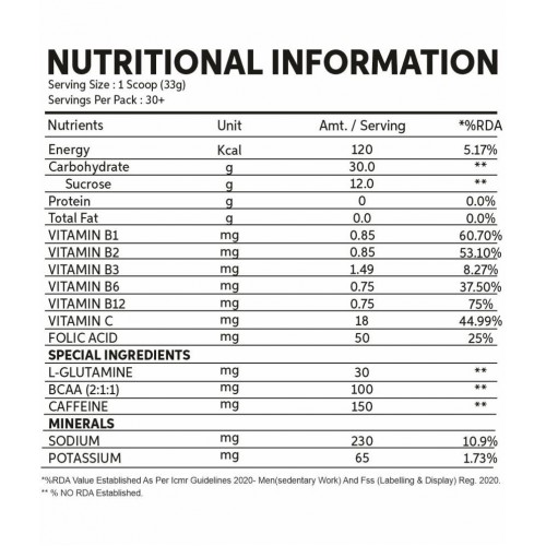 Energizing DrinkPowered with L- GlutamineLoaded with Vitamins C, B1 , B2, B3, B6de for Compensating the Lost Salt due to sweating
