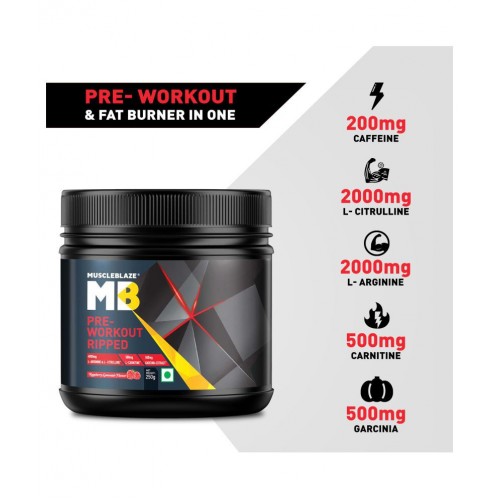 Pre-Workout Ripped is the new benchmark product from the house of MuscleBlaze® which fuels your mind and body and prepare you for intense workouts and burns fats simultaneously. This pre-workout supplement contains a clinically studied blend of L-Arginine Alpha Ketoglutarate and L-Citrulline DL-Malate that gives a robust pump. The active ingredients including tyrosine and slow and fast acting caffeine gives you a sharp focus to stay put during the entire heavy-duty workout. The thermogenic reactions arise due to the active ingredients including BioPerine and Garcinia Cambogia extracts.