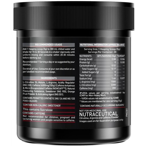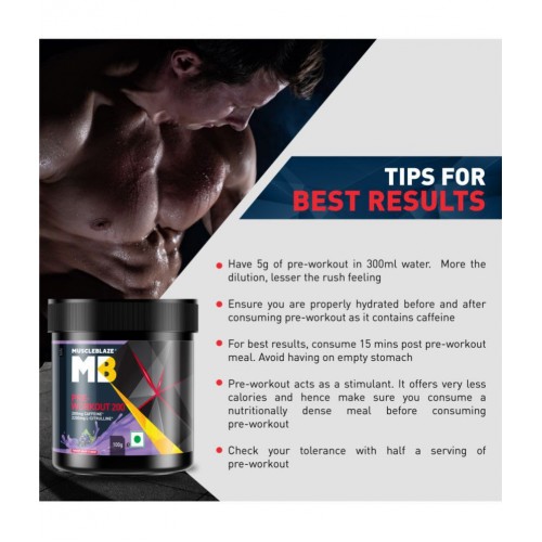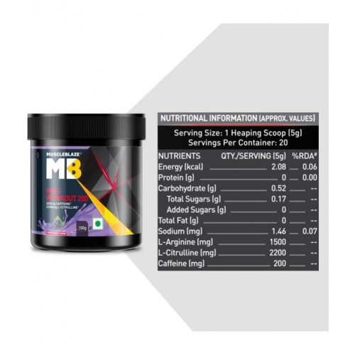 MuscleBlaze Pre-Workout 200 is a potent pre-workout formula that is crafted to let your body prepare itself for intense workouts. Each serving is power-packed with 3 proven pre-workout ingredients - Caffeine, L- Arginine & L-Citrulline. One serving of this pre-workout drink energizes you and helps you to focus better. This pre workout supplement delivers 200 mg caffeine to improve focus, alertness, and energy levels so that you can train like a beast without getting tired and hurting yourself due to a lack of vigilance. This potent pre-workout formulation contains 1500 mg L-Arginine & 2200 mg L-Citrulline to increase pump and enhance the nutrient-rich blood flow to your muscles. With no added sugar, it doesn’t provide any unnecessary calories. Perform rigorous exercises with better focus with the help of this advanced pre workout supplement. It is big on power & light on your pocket. Now available in three exhilarating flavours - Fruit Splash, Green Apple, and Furious Grape. Consume one serving before a workout for maximum effect.