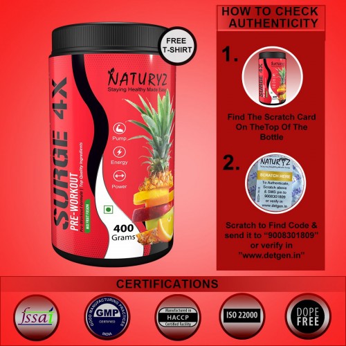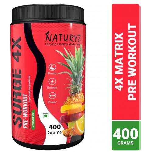 Naturyz Surge 4x Pre Workout Supplement is a fully loaded 4x Matrix formula jam packed with 11 Top Quality ingredients in a refreshing Mix fruit fusion flavour for fitness enthusiasts, bodybuilders and athletes to deliver to your muscles phenomenal Power, Pump and Energy when working out. Naturyz Surge 4x is Dope free and 3rd party quality tested pre-workout energy drink which is manufactured in GMP, HACCP & ISO certified facility to ensure the Purity & Quality of the Product. 1) FULLY LOADED 4X MATRIX PRE WORKOUT: Naturyz Surge 4x is an advanced Pre-Workout supplement with 11 Top quality ingredients to trigger 4 way action to deliver Incredible Muscle Pump, Increased Muscle Power and Strength, Maximize Energy & Focus and to Minimize Muscle Fatigue. 2) POWER & PERFORMANCE MATRIX: Each scoop delivers highest 4000mg Beta Alanine to build Endurance for a Powerful workout to break your records. Added with Creatine to increase power and improve physical performance for Men & Women. 3) MAXIMUM PUMP MATRIX: It is an ideal preworkout drink for Bodybuilders, Gym goers, Fitness enthusiasts & Athletes as it delivers incredible Muscle pump with 3500mg L-Citrulline.1000mg L-Arginine has been added for increased blood flow. Taurine as a muscle fuel enhances performance 4) EXPLOSIVE ENERGY & FOCUS: Now get unsurpassed energy to fuel your workouts to acheive the next level with 300mg Caffeine. No chance of crash. Alongwith Tyrosine for alertness and mental focus. 5) PREVENT MUSCLE FATIGUE: The Electrolytes Sodium and Potassium along with Niacin blend keeps you hydrated, reduces fatigue and enhances performance. The delicious Mix fruit fusion flavour satisfies your muscles and taste buds in one go. |
