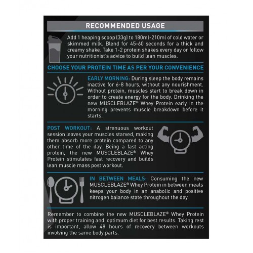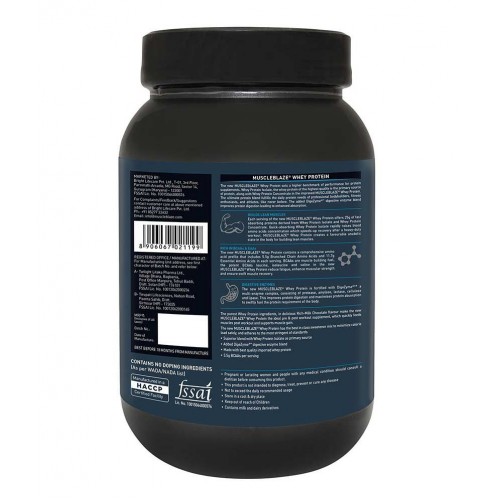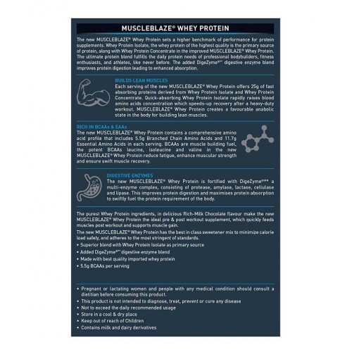 Have a stunning health with this Whey Protein from the house of MuscleBlaze and live a healthy life. This whey protein in rich milk chocolate flavour sets a higher benchmark of performance for protein supplements. Made of premium quality ingredients, this whey protein aids in maximising workout performance of fitness, muscle building enthusiasts and athletes. MuscleBlaze whey protein contains a comprehensive amino acid profile that includes 5.6 grams branched chain amino acids and 11.6 grams essential amino acids in each serving. BCAAs are muscle building fuel. The potent BCAAs leucine, isoleucine and valine help reduce fatigue, enhance muscular strength and ensure swift muscle recovery. Added digezyme, a multi enzyme blend helps improve protein digestion, thereby lowering any symptoms of bloating. Improved digestion ensures that maximum nutrients of this whey protein gets absorbed in fitness enthusiasts for speedy recovery and greater muscle synthesis. The best in class sweetener mix helps minimize calorie load safely, and adheres to the most stringent of standards. This blend has zero added sugar and zero aspartame.