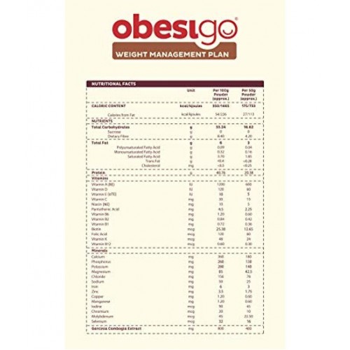 OBESIGO is a Healthy Meal Replacement formula for Weight Management, Weight Loss and Slimming. Unlike other meal raplements OBESIGO is a complete nutrition formula which ensure that you LOSE WEIGHT, NOT HEALTH.It contains High quality Whey Protein (whey Peptide & whey Concentrate) - Carbohydrate: Fructose based,making it an ideal weight loss shake for diabetes patients - Fiber : 6 type of fibers which makes you feel full and ensures prolonged satiety - Enriched with Garcinia Cambogia which is a natural Fat Burner - It is a gluten free formula. OBESIGO is a high quality scientifically formulated product and is a complete weight loss diet delivering assured results. Obesigo meal replacement shake has low calories which ensures faster weight loss with little excercise and lifestyle modification.