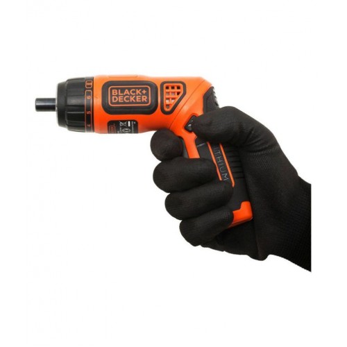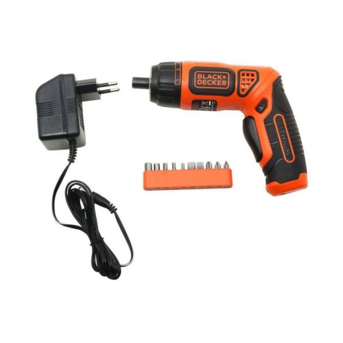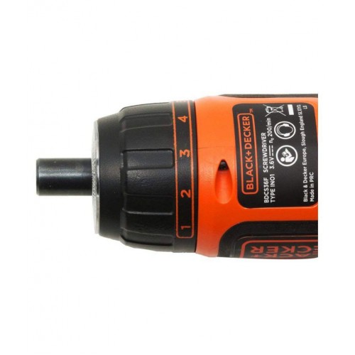 Black + Decker BDCS36F 3.6V Li-Ion Cordless Screwdriver with Accessories Black + Decker BDCS36F Screwdriver gives more comfort and control by allowing the user to choose between in-line or pistol use. This two position handle offers best ergonomic solution to suit user and application. Lithium-Ion battery which once charged holds its charge for up to whilst idle. The screwdriver is equipped with LED work light for visibility in dark areas, hidden corners, edges and inside furniture where the lighting conditions may be poor.