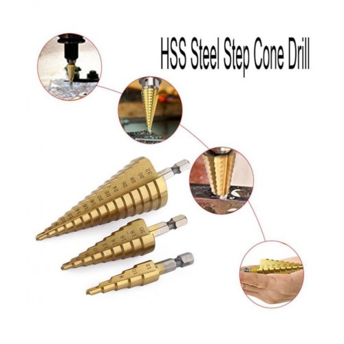 New HSS Steel Large Step Cone Drill Titanium Bit Set Hole Cutter, which is made from high quality HSS steel, and with the Titanium coated to reduce friction and heat The 3 cutters come in the following sizes increments of 2mm : 4 - 32mm ,4 - 20mm, 4 - 12mm. 100% brand new and high quality Parameters: 1. Material: high speed steel 2. Specifications: 4-32,4-20,412, hexagonal handle: about 6.35 mm/ 0.25 in 3. Applicable scope: woodworking punch 4. The product is available in 4-32,4-20,412 three specifications.