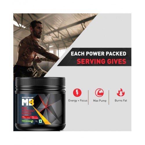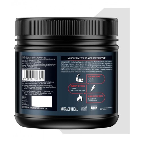 The new MuscleBlaze Pre-Workout Ripped in Green Apple Flavor provides dual action to boost endurance and focus while high-intensity workouts along with aiding in fat loss. This pre-workout supplement has a clinically studied blend of L-Arginine Alpha Ketoglutarate and L-Citrulline DL-Malate that gives a robust pump that makes the abundant amount of blood rush through the recovering muscles to transport more nutrients. The active ingredients including tyrosine and caffeine gives you a sharp focus to stay put during the entire heavy-duty workout. This pre-workout supplement supplies dual benefits to help you gain lean mass while losing excess fats gradually.