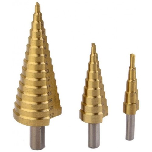 This is the New HSS Steel Large Step Cone Drill Titanium Bit Set Hole Cutter, which is made from HSS steel, and with the Titanium coated to reduce friction and heat It is very suitable for using to cut holes in a variety of materials including steel, brass, wood, plastic, etc treatment : Titanium plating The 3 cutters come in the following sizes increments of 2mm : 4 - 32mm ,4 - 20mm, 4 - 12mm. Set of 3 for jobs of all sizes. 2 fluted edges for faster, smoother cutting. 3 sided shanks prevent slippage when in chuck. Made from HSS steel. Material: HSS steel Color: Golden Quantity: 1 set (3pcs) Note: Due to the difference between different monitors, the picture may not reflect the actual color of the item. Please understand, Thank you. Package includes: 1 x Set of 3Pcs HSS Drill Bit