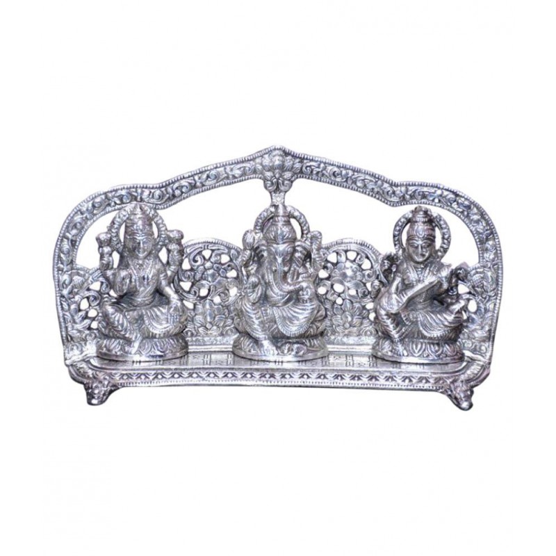 Metal Laxmi Ganesh & Saraswati Exquisitely hand-crafted in India by master artists. Material : Aluminium; Product dimension - LxHxW(cm) = 24 x 15 x 6 Washable- Wash gently, don't scrub