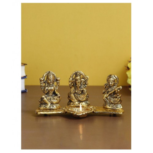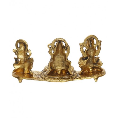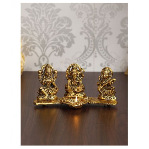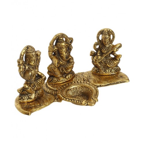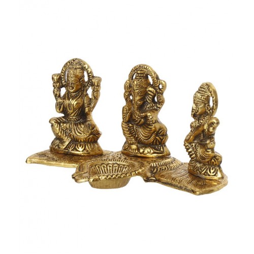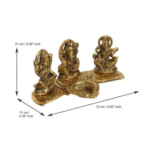 Lend a hint of decoration to your home with this eCraftIndia Golden Laxmi Ganesha Saraswati with Diya on Leaf Chowki Handcrafted Metal Decorative Showpiece. Exquisitely designed, this Diya has unique antique look. This gorgeous and exquisite figure is perfect for your home decor. It is made of metal in golden finish. It's a wonderful keepsake for your home and unique as gifts for your loved ones. This designer Deepak or Diya isn't just a Diya, its a multipurpose decorative embellishment for all modern homes. The beautiful diya is bright and beautiful for any temple or home and has been handcrafted by eCraftIndia using modern and traditional techniques.