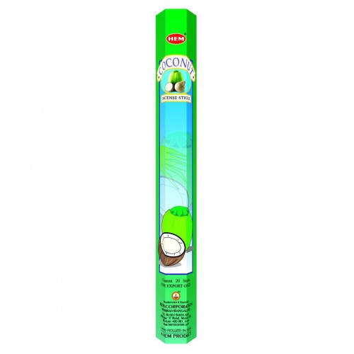 The value of incense sticks has been known in the Indian tradition from the time of Gautama Buddha in ancient India. Incense making is an art and the sense of smell is the most powerful of all our senses. Smell triggers memories, experiences and events from this life, and it is an historical truth as told to us by the holy Saints. \n The kamadhenu or fruit of life, coconuts are an inextricable element of life in parts of India. HEM Coconut incense sticks has distinctive fragrance that pours forth the goodness of the fruit. \n Fragrance of Coconut \n Content : 120 sticks \n Burning Time : 35-40 mins