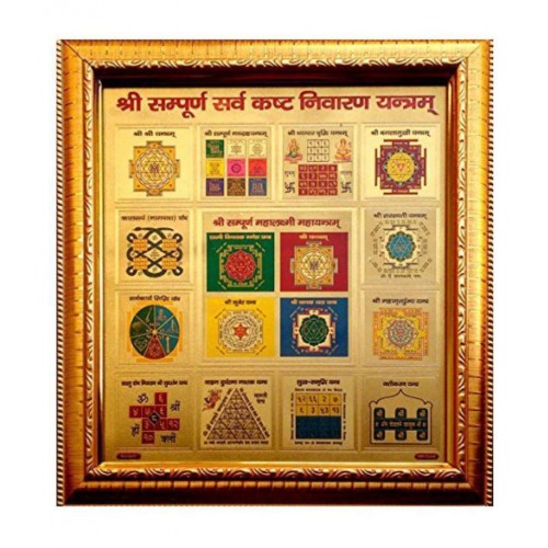 BIG SHRI SAMPURNA SARV KASHTA NIVARAN GOLD PLATED YANTRA:- BIG SHRI SAMPURNA SARV KASHTA NIVARAN GOLD PLATED YANTRA WITH BEAUTIFUL FRAME IT IS BELIEVED THAT Sampoorna means complete. Sarva means all. Kastha means difficulties and pain. Nivaran means removal. Sampoorna Kasht Nivaran Yantra is to remove all obstacles and bestow you with success and prosperity. Picture May Be Slightly Different from the product Size :- TOTAL PRODUCT SIZE INCLUDING FRAME IS APROX 9 BY 9 INCHES AND METAL GOLD PLATED YANTRA SIZE IS 9 BY 9 INCHES QUANTITY :- 1 PIECE COLOR :- GOLDEN FRAME WITHOUT GLASS FRAME COLOUR CAN BE CHANGE