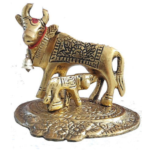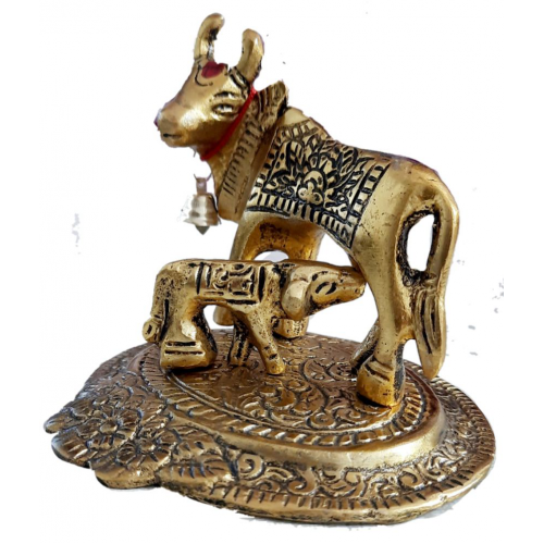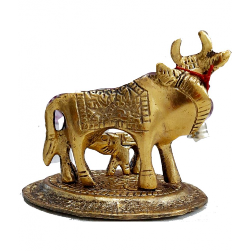 Nicely carved kamdhenu cow statue is in top quality of metal. Its oval shaped base is carved in floral designs with fine work.