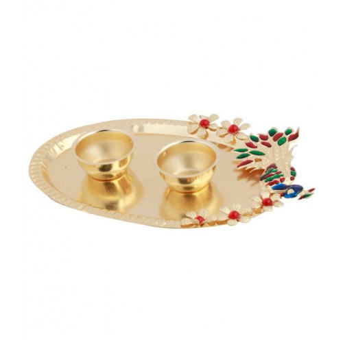 Presented Gold Plated Designer-Ethnic oval Shape Peacock Design Kankavati pooja thali,consist of 2 Kumkum and chawal holder.this Product Made of Brass Material.This pooja Thali can be used in multi purpose.This pooja thali can be use as Diwali pooja, Laxmi pooja, Raksha bandhan or in any rituals. This can be Used to give Gifts to your near and dear ones in any celebration.