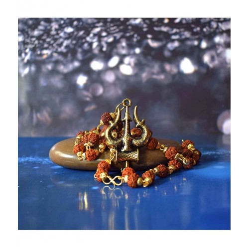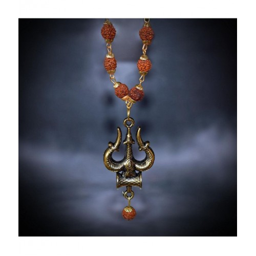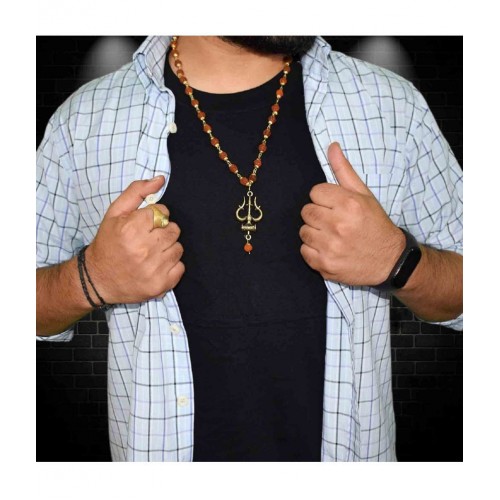 HOMETALES Men's and Agate Gold-Plated Brass, Wood Lord Shiv Trishul Locket with Panchmukhi Rudraksha Mala For Men