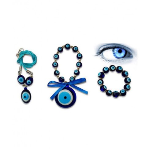 Nazar Raksha Kavach is the best and easiest way to protect you and your loved ones from evil eye. This Nazar Raksha Kavach package is a set of three items . Each one is made up of evil eye beads. Evil eye beads are the most widely used remedy for protection against evil eye. Its believed that there are three types of evil eyes- The first are unconscious evil eyes. These harm people and things, without intending to. The second type intends to harm. The third one is unseen, hidden evil which is the most scared one. In daily life you can find glass evil eye charms almost everywhere. People donate everything they love or appreciate with these blue evil eye charms. They attach an eye bead to the clothes of a new-born baby. They buy gifts with an eye bead for their sweethearts. They bring gifts with eye bead for a new office or a new car. Almost everywhere you see thousands of blue eyes, that aim to stop the evil eyes with an eye amulet.