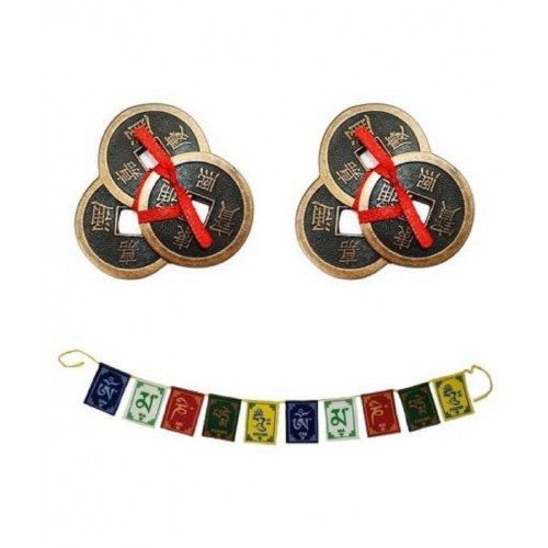 PAYSTORE Combo Of 2 Feng Shui Three Lucky Chinese 2" Coins with Red Ribbon for Money, Wealth & Tibetan Buddhist Om Mani Padme Hum Positive Vibes Prayer Flags for Car/Motorbike -3 Feet Multicolor Decorative Showpiece - 5.5 cm