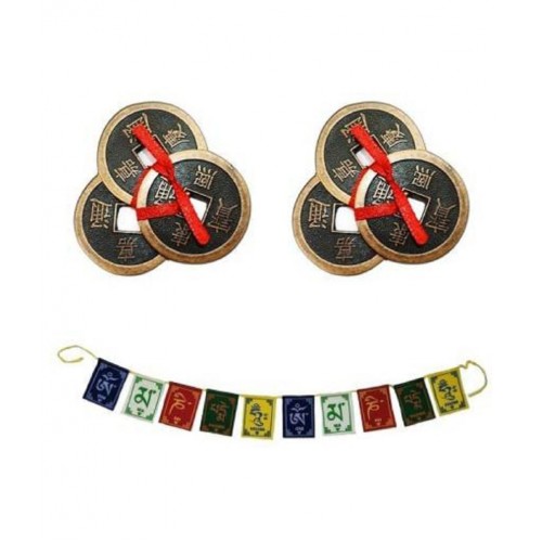 PAYSTORE Combo Of Feng Shui Three Lucky Chinese 2" Coins with Red Ribbon for Money, Wealth & 2 Tibetan Buddhist Om Mani Padme Hum Positive Vibes Prayer Flags for Car/Motorbike -3 Feet Multicolor Decorative Showpiece - 5.5 cm