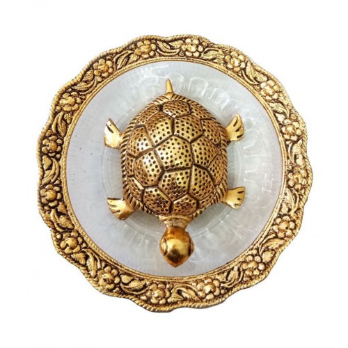 The Tortoise or the Kachua represents the maximum age and longevity, strength, determination and will power. Tortoise Is Important In Both Vastu Shastra And In Feng Shui. As Tortoise Is Gifted With Long Life Therefore In Vastu Shastra And In Feng Shui It Gives Long Life. As In Hindu Puranas, Lord Vishnu Took The Form Of Tortoise To Uphold The Earth And Its Beings During The Sagar Manthan; Lord Vishnus Tortoise Is Second Avatar And Is Called As Kurma Avatar. These Days You Can Find Tortoise In All Homes Who Believe In Vastu Shastra And Feng Shui. They Are Made Up Of Resins, Metal, Glass, Mud, Crystals Or Else Of Wood.The glass plate which holds tortoise has floral and leaf pattern golden metallic border and has a diameter of 5.5 inches. The metal tortoise is crafted with perfection and has numeric pattern engraved on the bottom inner side which is considered to be very auspicious and brings wealth. The plate is not meant to be filled with water. The engraved design on the glass plate may vary as it is handcrafted.