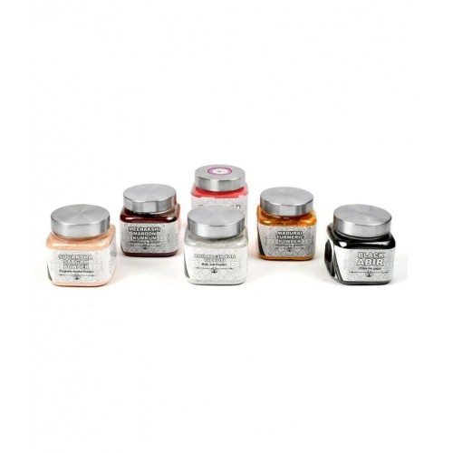 Set of Tilak used in Puja. Fragrant and natural. Take a small quantity at the tip of right hand middle finger and offer to deity idols. Content:Madurai Turmeric Powder, Gulal, Abeer, Meenakshi Kumkum, Brihadeeswar Vibhuti, Sugandh Sargam Powder.