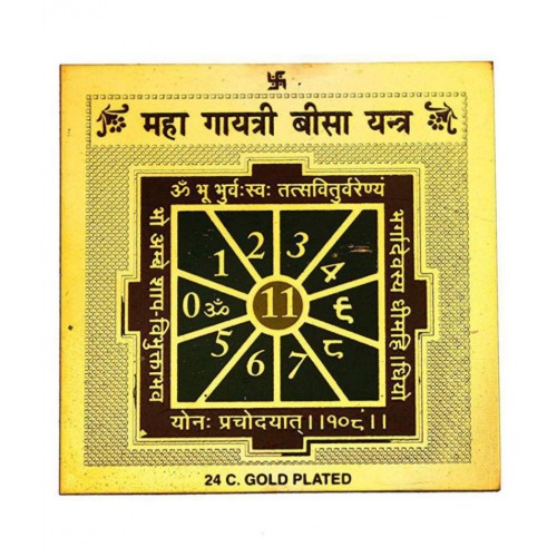 SIZE :- LENGTH – 3 INCHS & BREADTH – 3 INCHS METAL USED – MIXED ASTHADHATHU Gayatri Devi is believed to be a good luck charm. The other name of Gayatri Devi is Maha Devi and she is the deity for the Maha Gayatri Bisa Yantra. If you too want to experience good luck in your life, then Maha Gayatri Bisa Yantra is an ideal option. This Yantra is inscribed with the blessings of Gayatri Devi and has inscribed Gayatri Mantra that helps an individual and their family. It is said that if a person pray to this Mantra daily in the morning and evening, they can observe good luck in their way. This Yantra helps you to increase and improve physical and mental strength, protects from enemies, cures diseases and many more. The power inscribed in this Yantra has done wonders for many people.