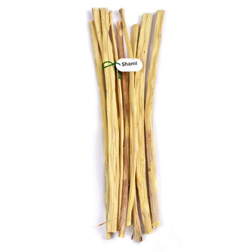 The Shami also known as Khejri and Banni represents the planet Saturn or Shani. The Shami wood is used for offering in the sacred fire in yajnas and homams. It helps pacify the ill effects of planet Shani and promotes the positive effects of the planet. Using the Bhasma (ash) from the puja instills the defining qualities of the Saturn - discipline and regulation.
