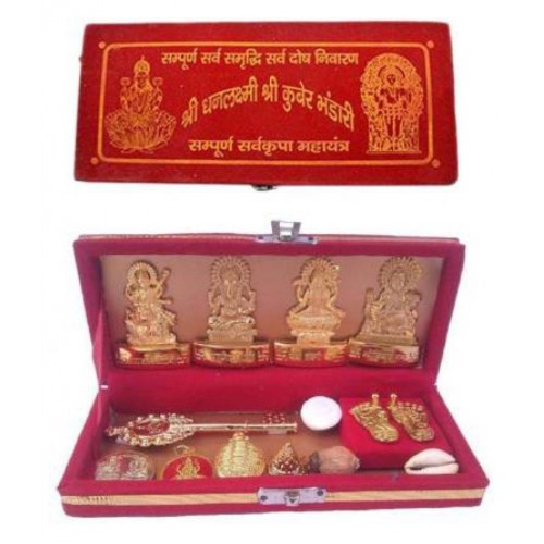 Shri Dhan Lakshmi-Kuber Bhandari Yantra Kit which is best known among the devotees, as a means to get the blessings of Lord Kuber and Devi Lakshmi. It brings great wealth, money and income from all possible sources to a person who worship all these miraculous items. This kit includes small gold plated Lakshmi idol, Kuber idol, Shri Yantra, Kuber Yantra, Lakshmi Charan Paduka, Tortoise, Ekakshi Nariyal, Lakshmi Karak Kaudi and Locket of Shri Maha Lakshmi. All these items are made up of high quality gold plated material which lasts for a long time. This yantra kit is fully effective and miraculous and start showing its results within 7 days. Many devotees have experienced the divine miracles of this yantra in the form of sudden wealth, money and income with name and fame. If worshipped with full devotion it boosts up your business and industry with great profit. You are just a few clicks awy from getting rich with this miraculous yantra kit.